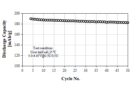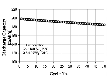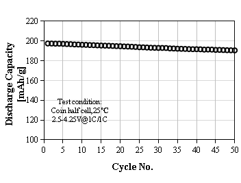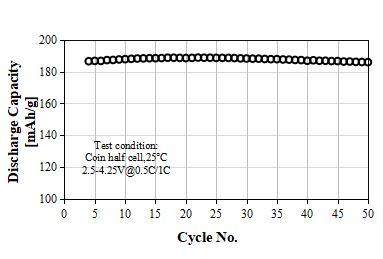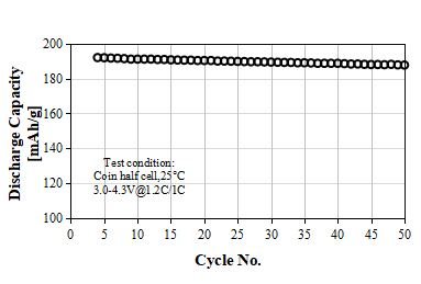 L-5050 Product Application: Used for 18650 or prismatic batteries, 1C discharge capacity as 161 mAh/g at 4.2V, cycle performance:80% capacity retention after 2000 cycles at 1C/1C, used for electric vehicles or power tools.