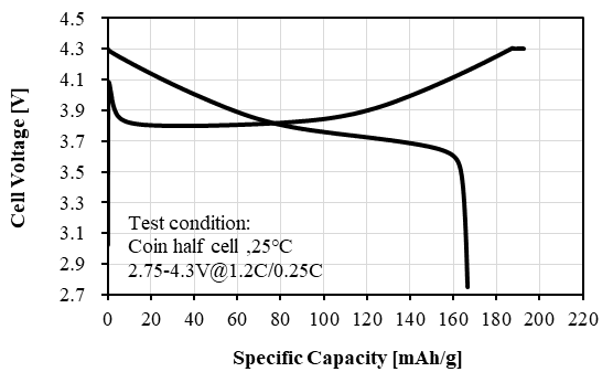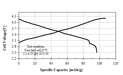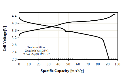 NF-S1 Product Application: Used for pouch or prismatic batteries, in coin-cell test, 0.5C discharge capacity as 91.50 mAh/g at 4.50V, cycle performance: 90% capacity retention after 50 cycles at 1C/1C, used for electric vehicles or energy storage.